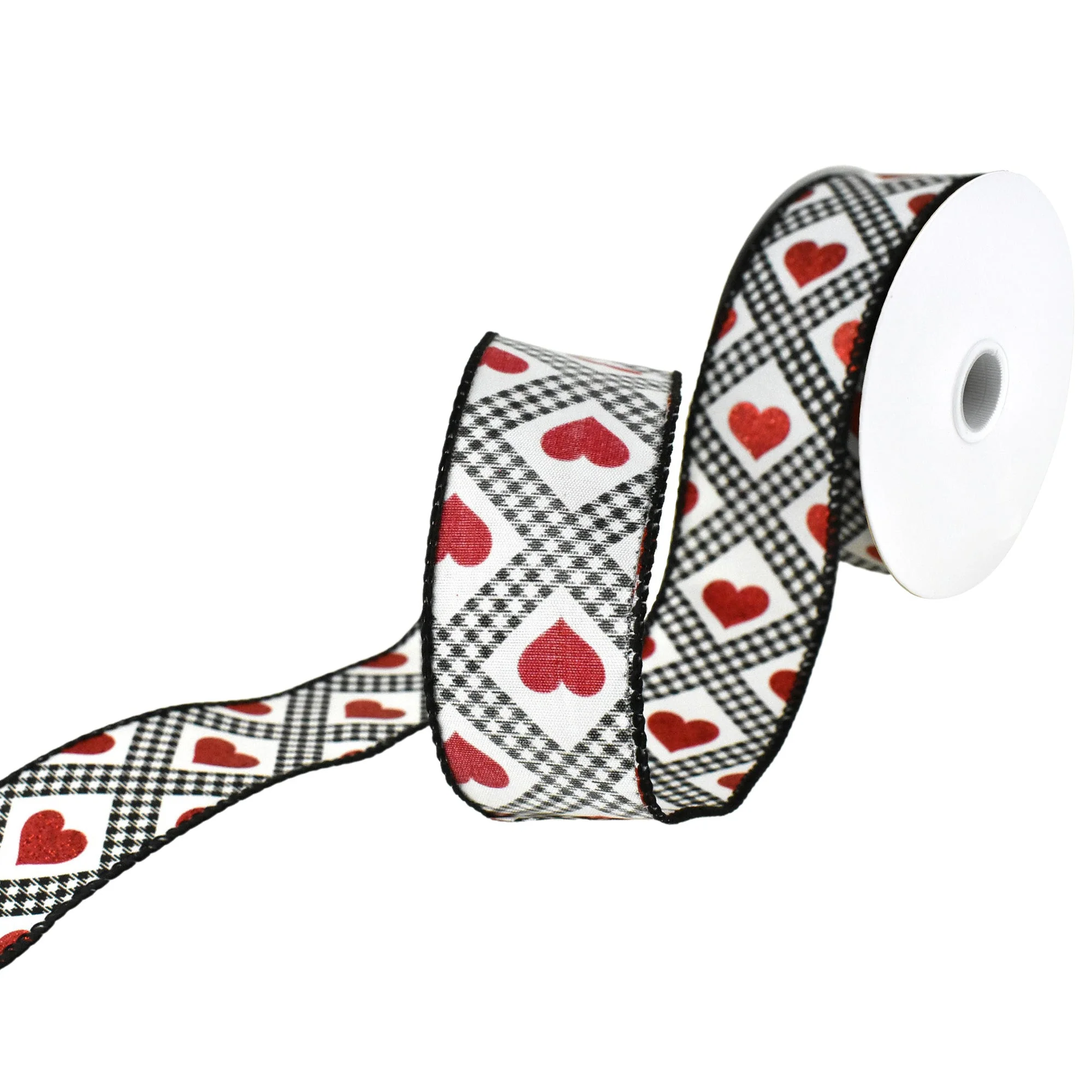 Add a touch of sweet to your Valentine's Day decor with this versatile wired ribbon! With hearts, glitter and a cute gingham houndstooth design, this ribbon is ready to complete any crafts, gift wrapping or home decorating project! It can also be used to decorate packages, cakes, cupcakes and more! Note: Contains wire Length: 10 yd Width: 1.5"